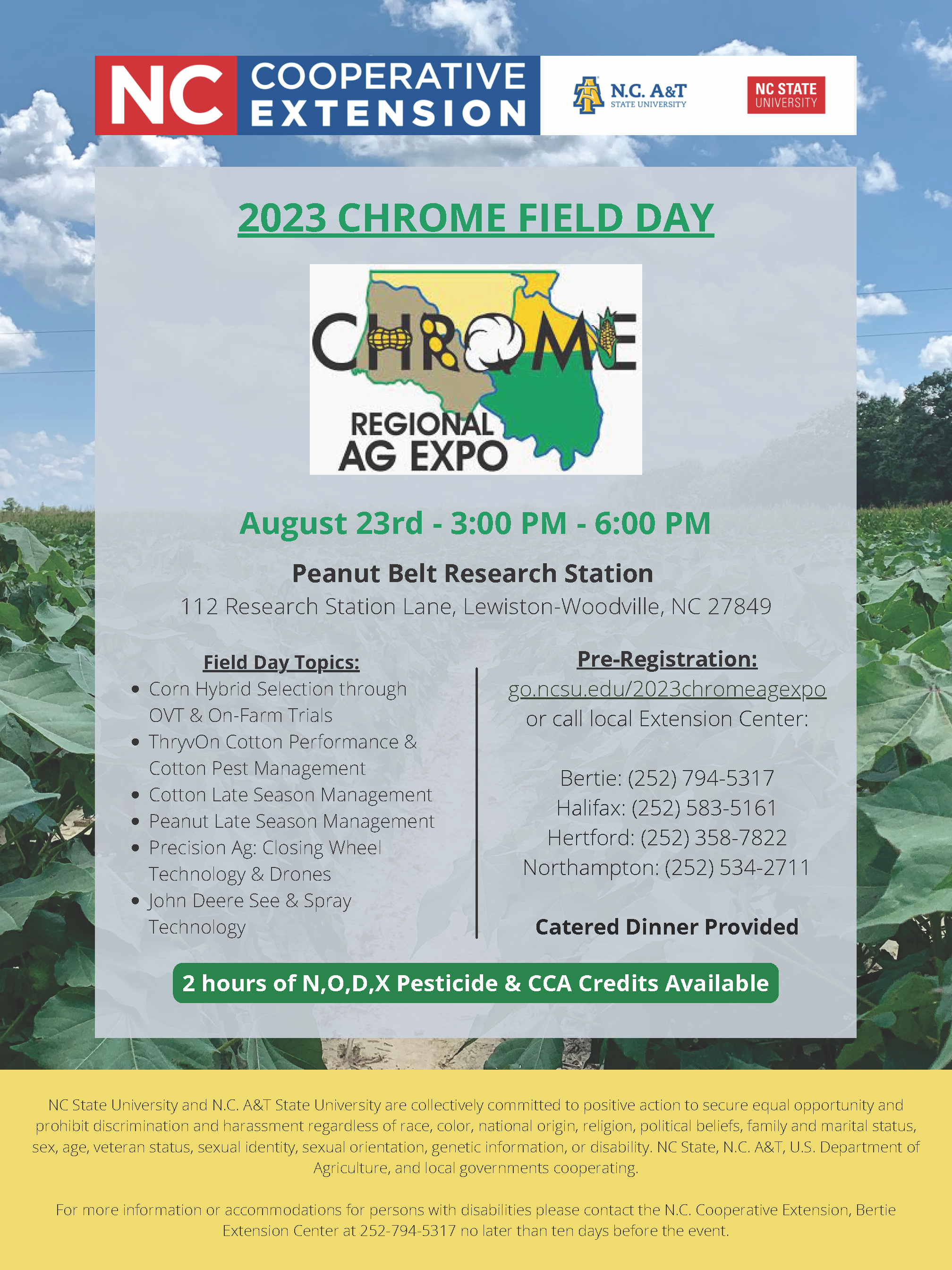 The CHROME Ag Expo Field Day will be on August 23rd 3:00 - 6:00pm at the Peanut Belt Research Station 112 Research Station Lane, Lewiston-Woodville, NC 27849. Register Online!